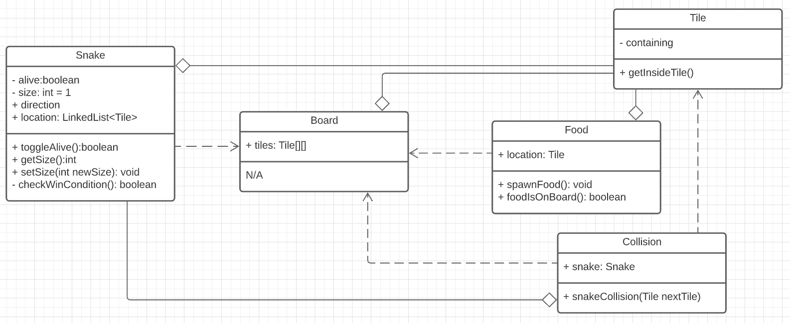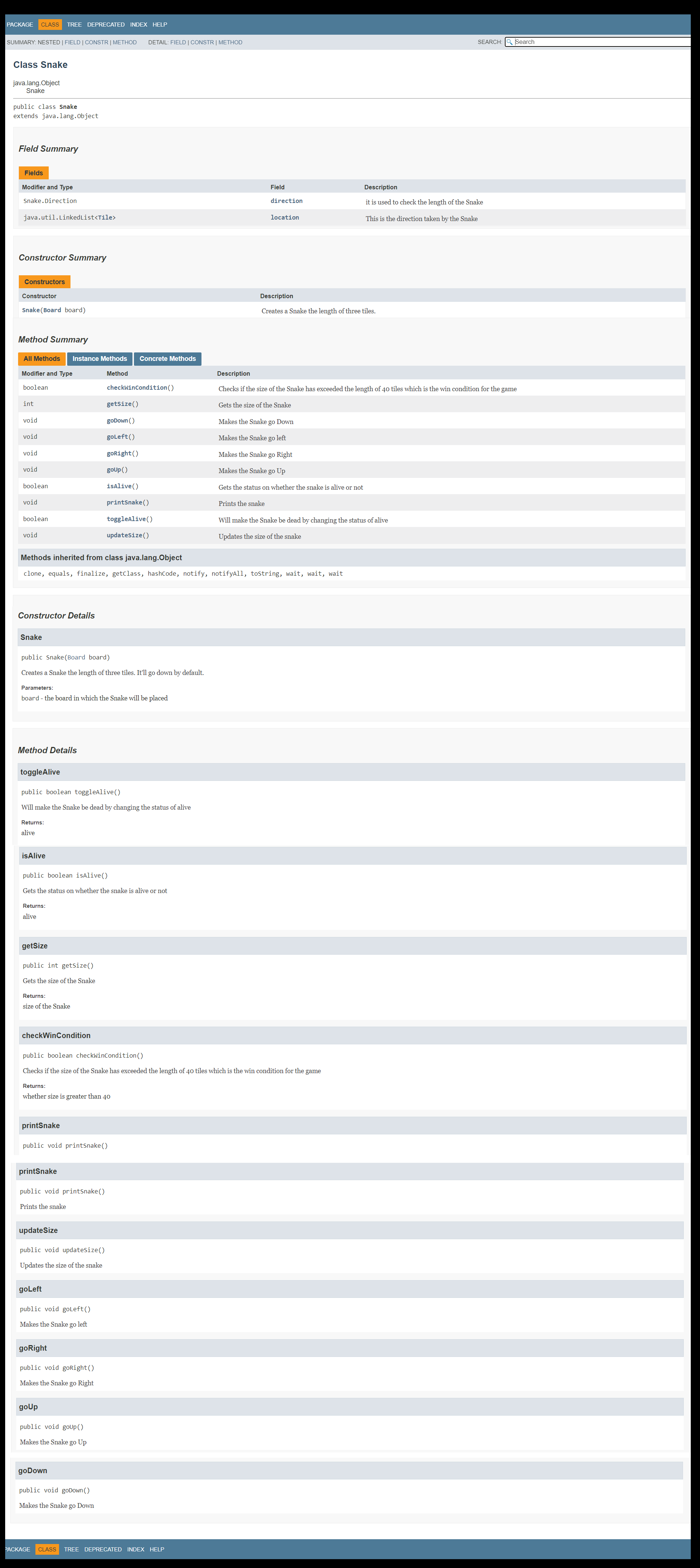 Some of the key Java classes that made this project possible were Model, Controller, View, Board, Collision, Food, Snake, Tile, and Game. The win condition of the game is reached when the Snake's length reaches half the size of the board size. One of the things that were well done in this project, was the testing and documentation. We generated javadocs for every class. I could've uploaded them to this page to show, but because they are quite heavy, I will simply show how one of them looks like. Here's the Snake javadoc as an example: