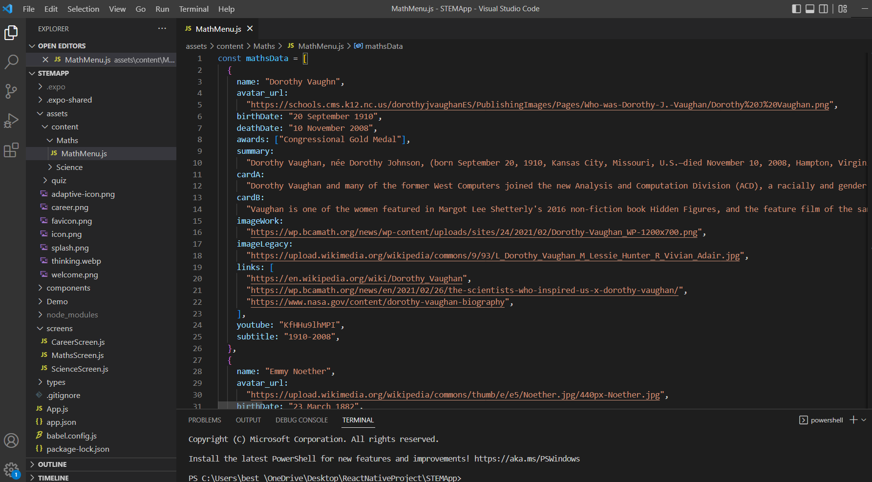 As a Software Developer intern at CDK, I worked on 3 projects. The third and smallest one of the three, yet very fruitful, was my involvement in the "g4g project" where I teamed up with Samarth Goudar, Abhitej Arora, Sameer Joshi, Sathwik Nadella, and Saurabh Vijaywargia. In a competition of about 10 different teams of Software Development Intern groups, the objective was to produce some kind of application aimed at young girls, to encourage them to get involved in tech. My team and I had the idea of producing a mobile app, based on React Native, that could be run on iOS and Android. This app, would display 9 female Mathematicians and 9 female scientists (that are not mathematicians), and would show their greatest works and bio.